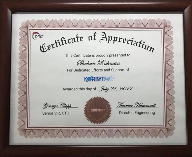 Got this certificate from RMG Networks 2017 for the appreciation for my dedicated efforts and support of releasing their new application KorbytGO.